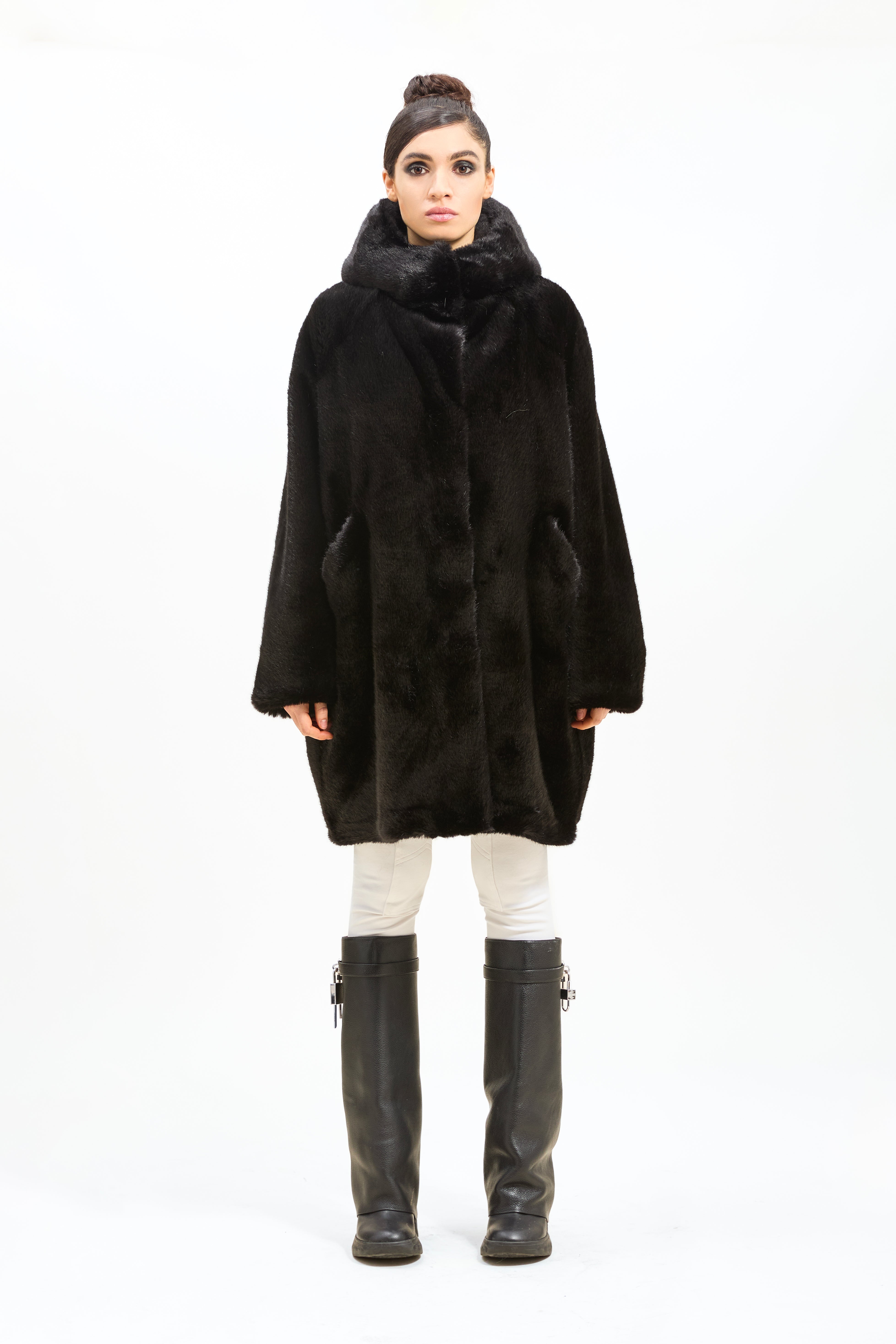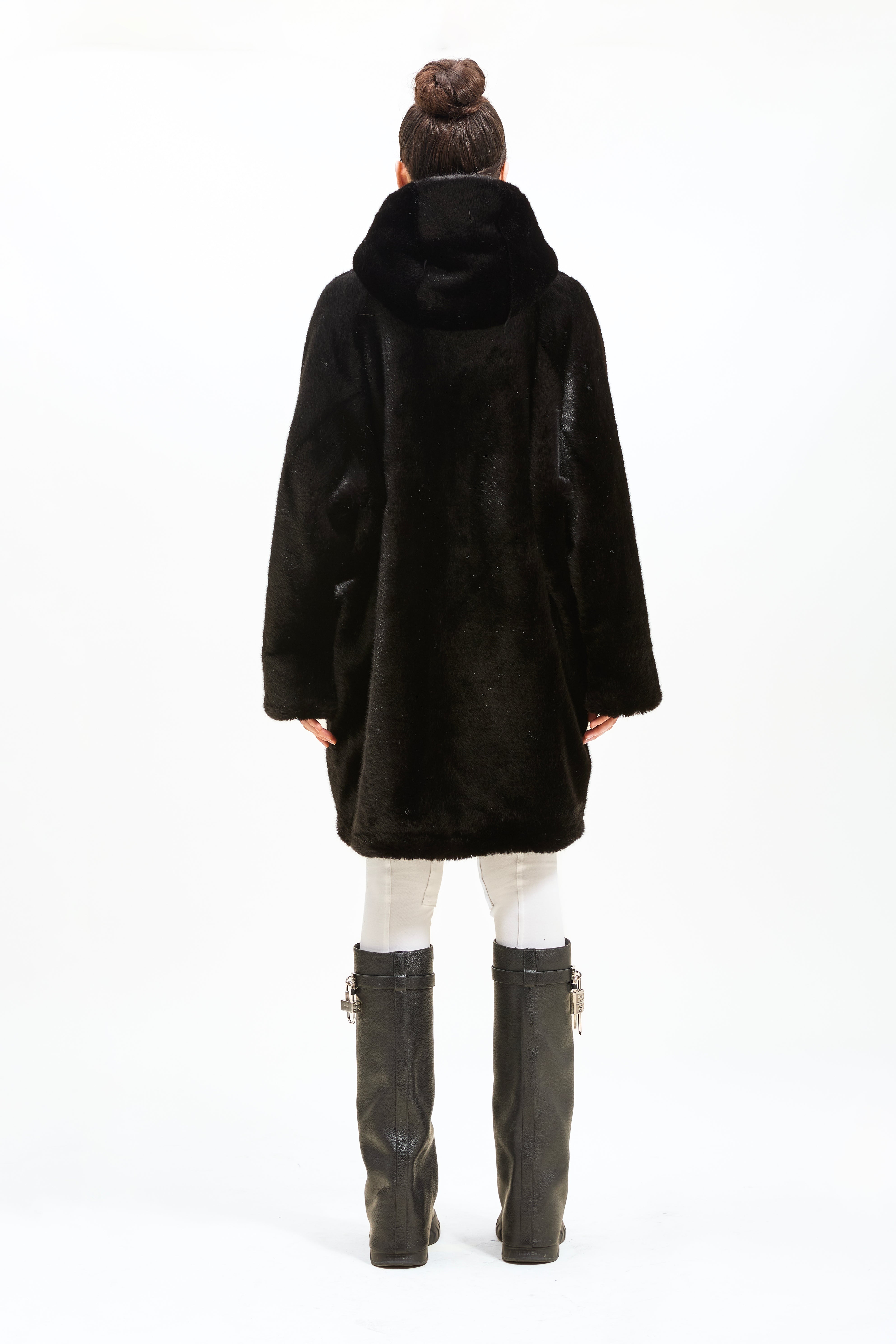 Parka nero in castoro rasato con cappuccio e coulisse sul fondo. Chiusure con tre bottoni e tasche a filo.