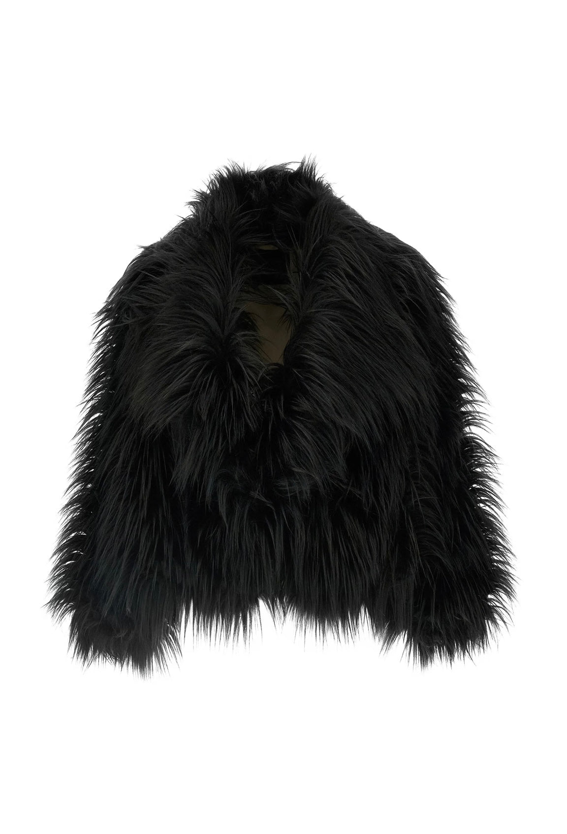 Giacca corta fino ai fianchi in eco mammuth nero, con revers ampi sul collo. Senza bottoni con tasche laterali, l'effetto di questa pelliccia ha uno stile fashion e grintoso e la lavorazione del pelo al contrario da un volume e un movimento morbido.
