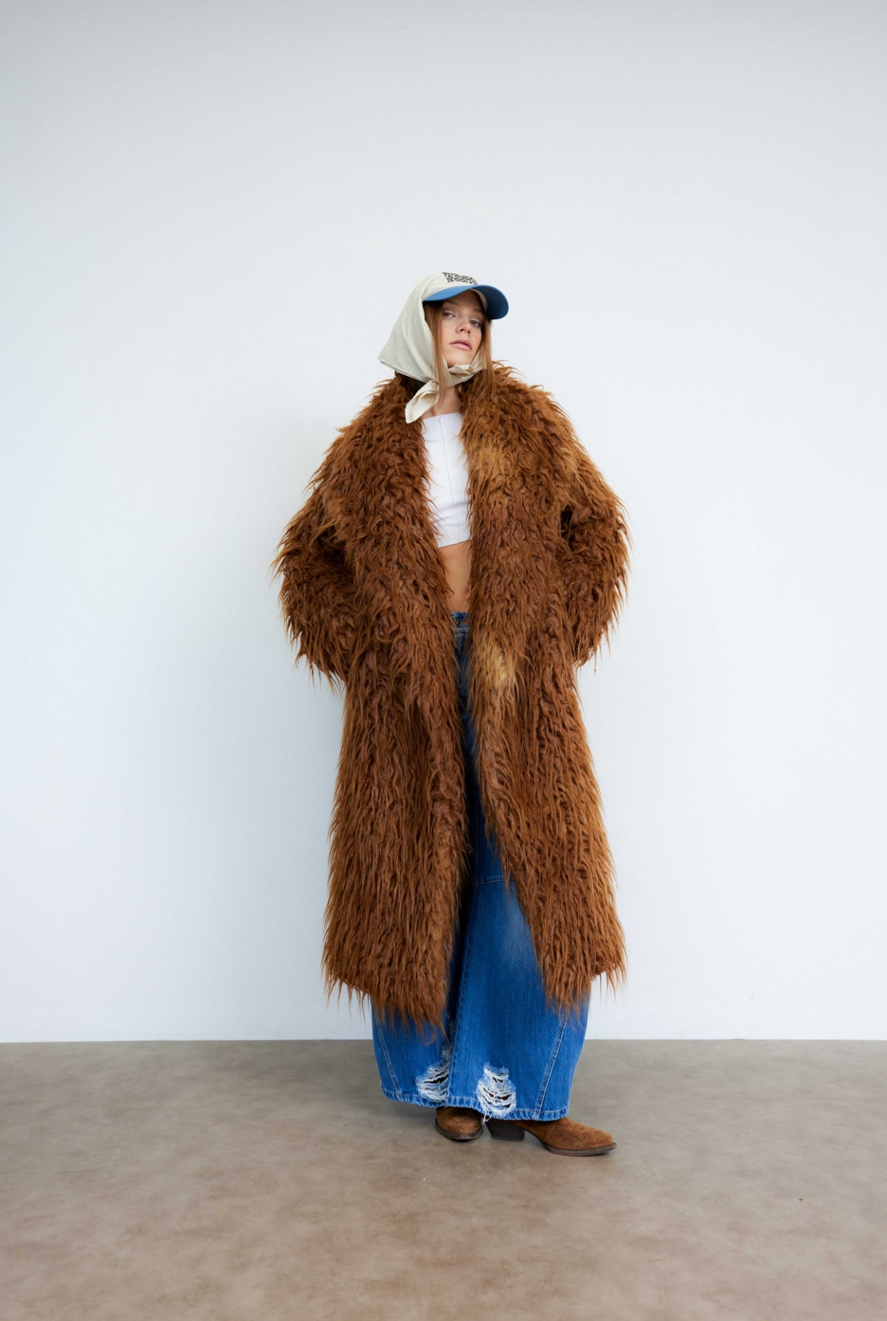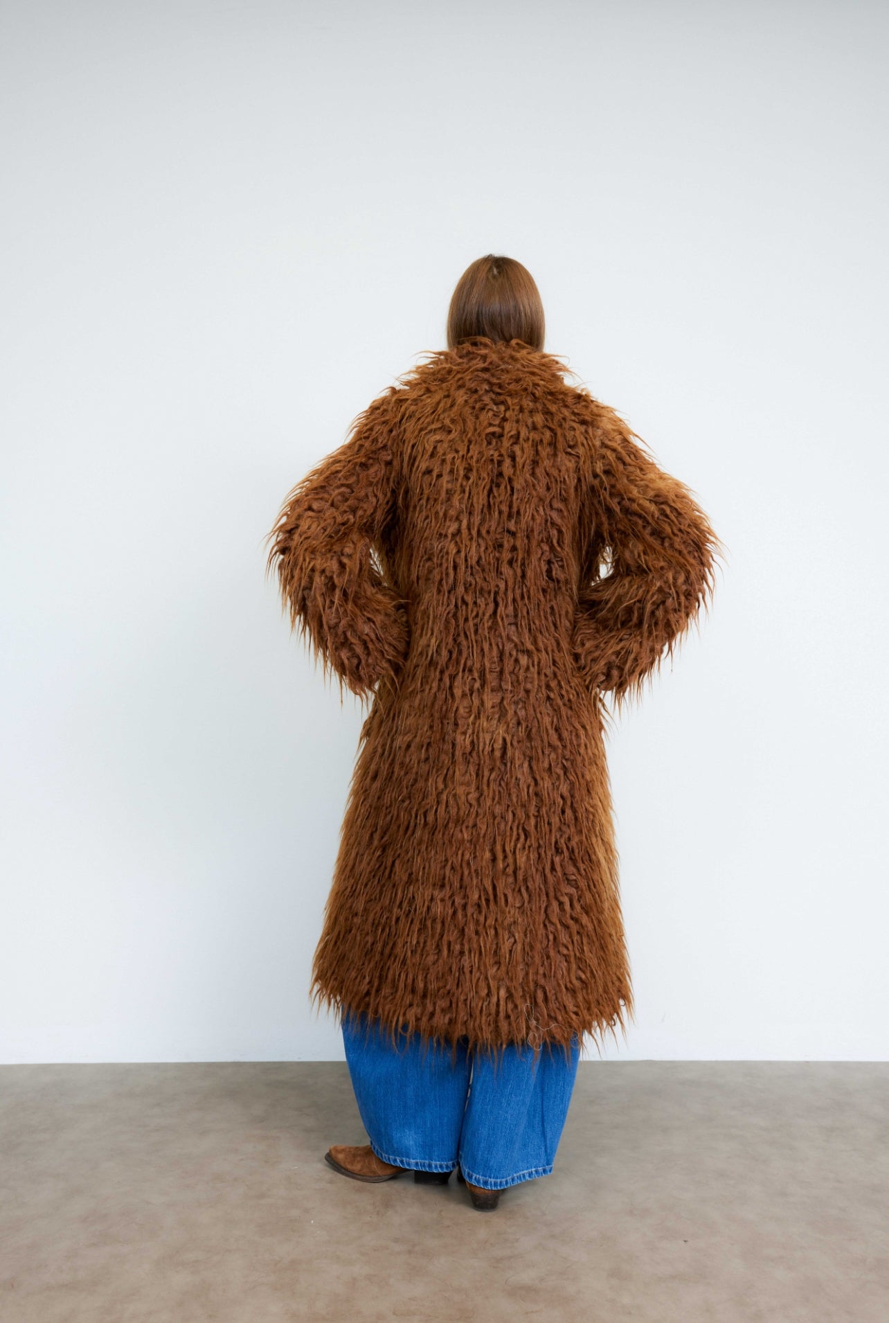 Cappotto Canyon in tessuto effetto pelliccia sui toni caldi, caratterizzato da un design avvolgente e dal forte impatto visivo. La linea lunga enfatizza la fluidità del capo, conferendo un’allure sofisticata e contemporanea. Il collo sciallato, morbido e avvolgente, accompagna la silhouette con eleganza, mentre la vestibilità regolare ne valorizza la portabilità quotidiana senza rinunciare al carattere deciso. Le tasche a filo, discrete e funzionali, si inseriscono armoniosamente nella struttura del cappotto, mantenendo un’estetica pulita e bilanciata. La fodera interna liscia in 100% viscosa beige assicura comfort e una piacevole sensazione sulla pelle, completando un outerwear dal fascino boho-chic, ideale per chi desidera un capo caldo, ricercato e distintivo.