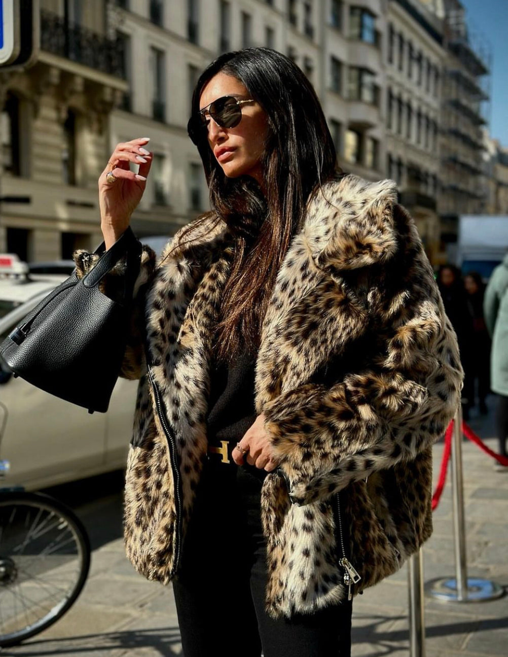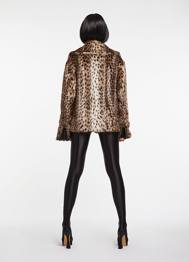 Leopard effect biker, wide collar, with pockets and closure on the front.