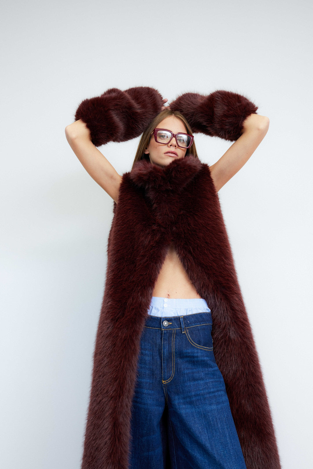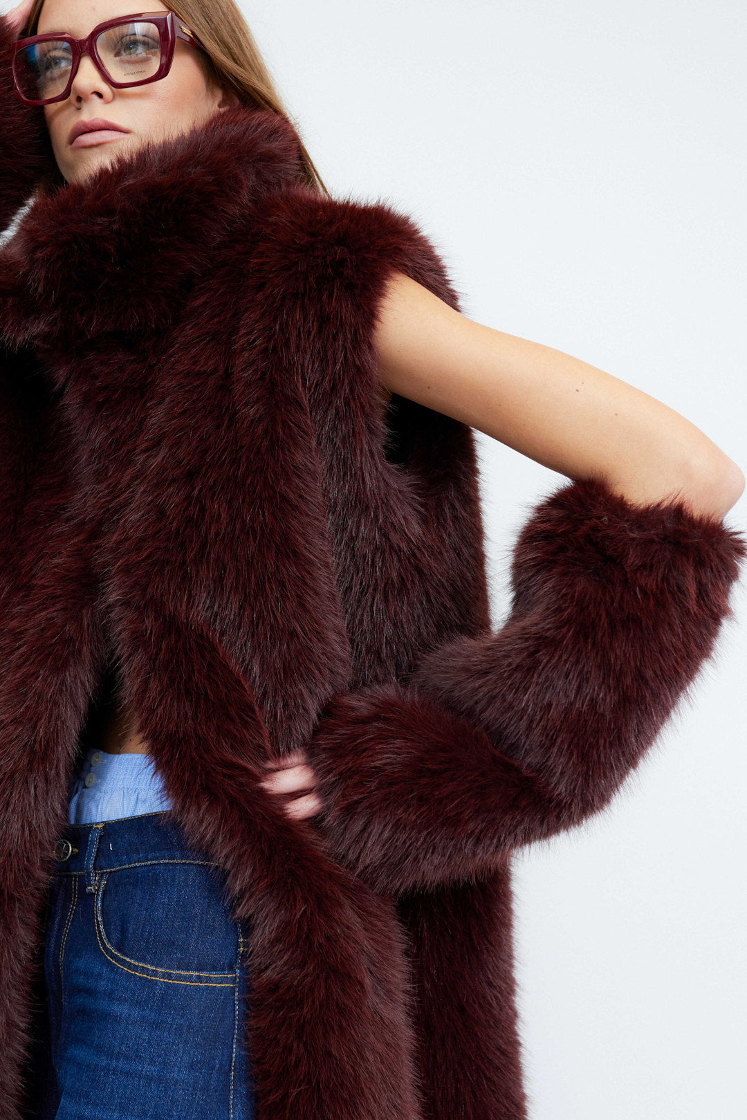 Gilet Scarlett in tessuto effetto pelliccia, proposto nell’elegante tonalità bordeaux, intensa e sofisticata. Il design essenziale e femminile è valorizzato dal colletto morbido che dona struttura al capo, mentre i manicotti coordinati aggiungono un dettaglio ricercato, perfetto per completare look raffinati con un tocco contemporaneo. Le tasche a filo, integrate con discrezione nella linea pulita del gilet, garantiscono funzionalità senza rinunciare all’eleganza. La fodera liscia in viscosa assicura una sensazione confortevole e un’eccellente vestibilità, rendendo il capo ideale per un outerwear chic e versatile.