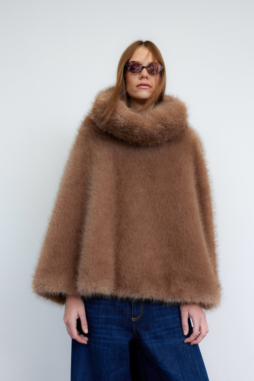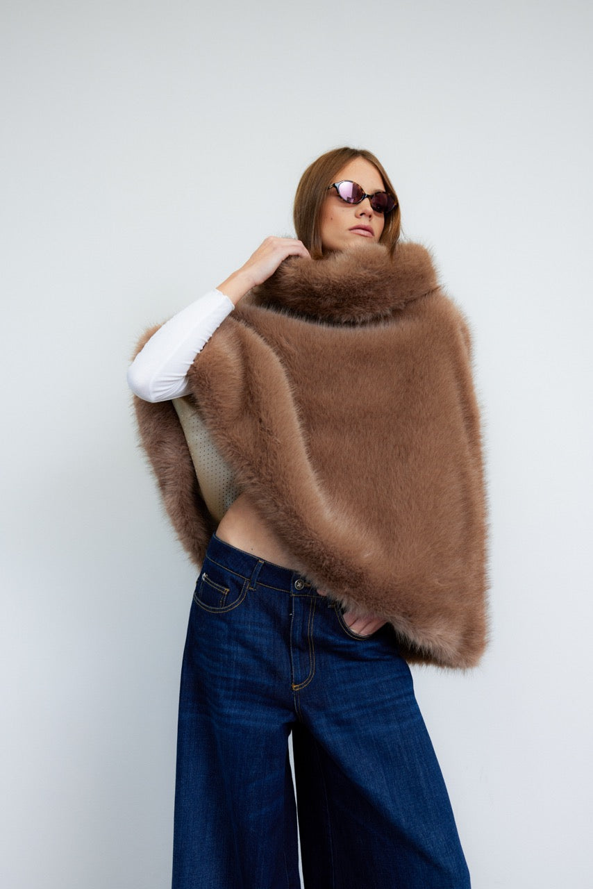 Eleganza calda e sofisticata per questo poncho in finto visone color biscotto. Caratterizzato da una texture avvolgente, dona stile e comfort nelle giornate più fredde. Fodera beige. La modella è alta 1,75 e indossa una taglia 42.