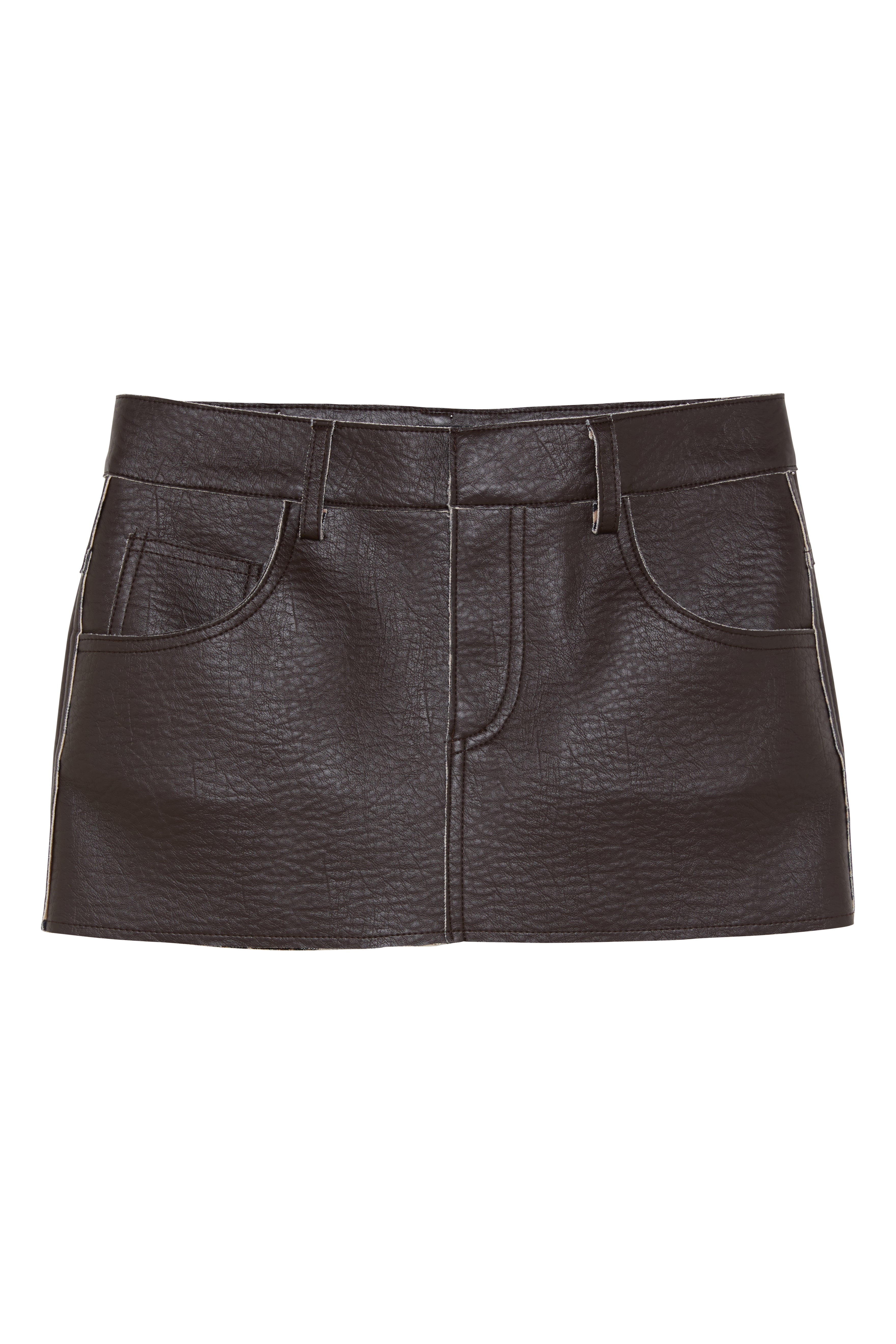 Minigonna marrone scuro in finta pelle dal carattere deciso, pensata per definire look contemporanei e versatili. Il design strutturato presenta quattro tasche funzionali e un taglio vivo che dona un tocco moderno e grintoso. La vita è arricchita da passanti, mentre la chiusura frontale con zip e bottone rivestito garantisce una vestibilità pratica e curata. La fodera interna con stampa zebrata aggiunge una nota inaspettata e distintiva.