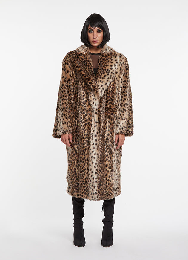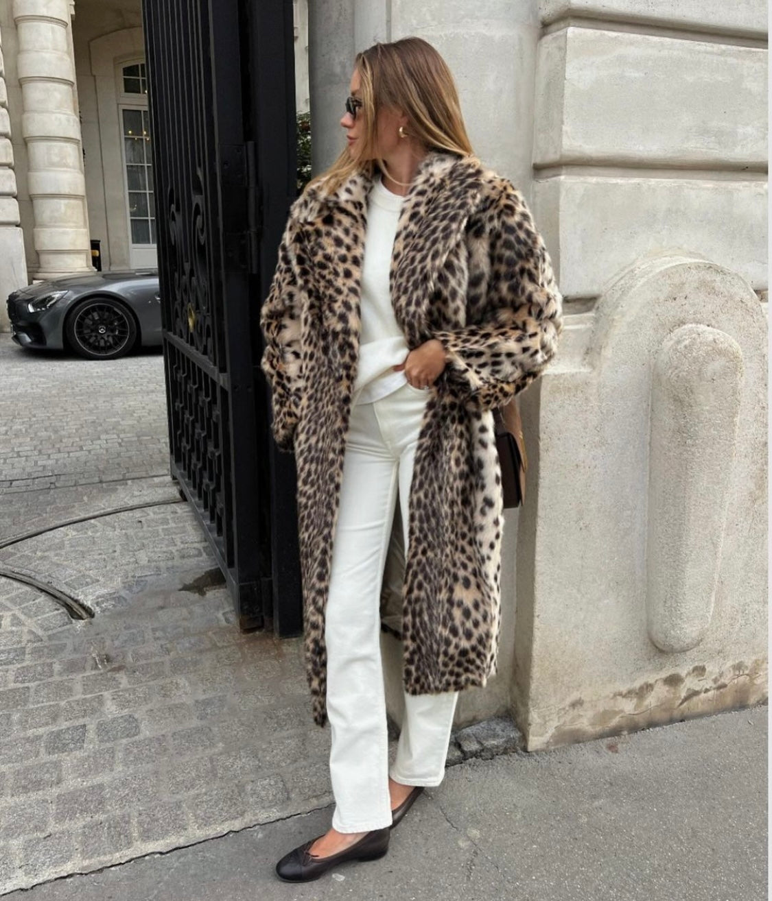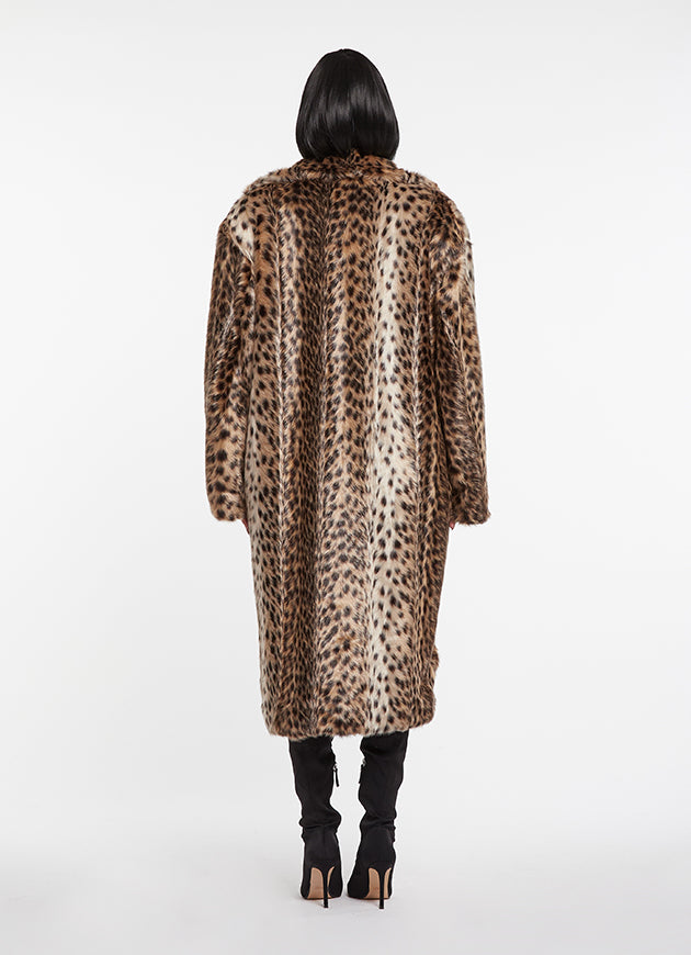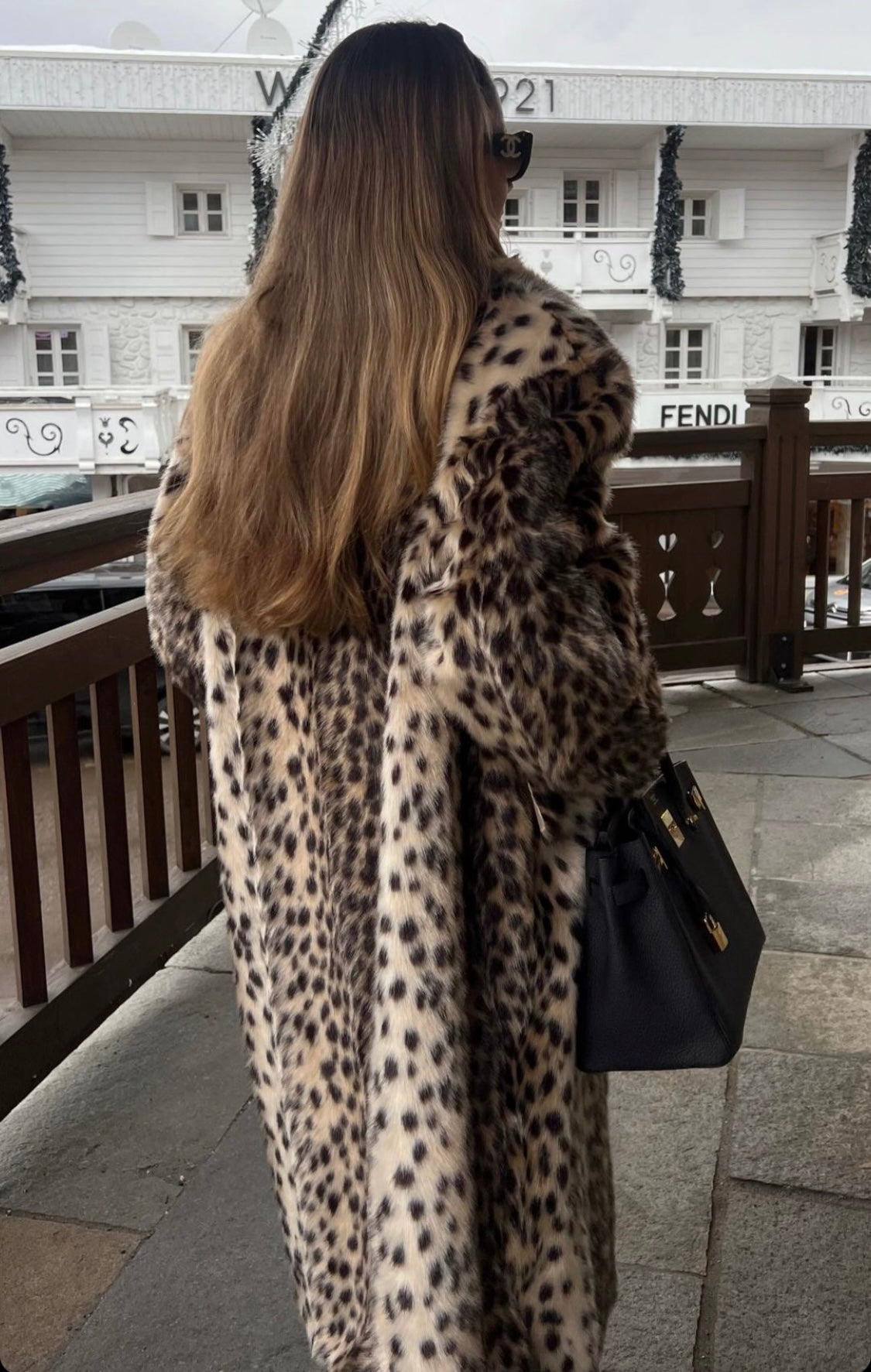 Cappotto effetto leopardo, collo ampio, con tasche con pattine e chiusura sul davanti.
