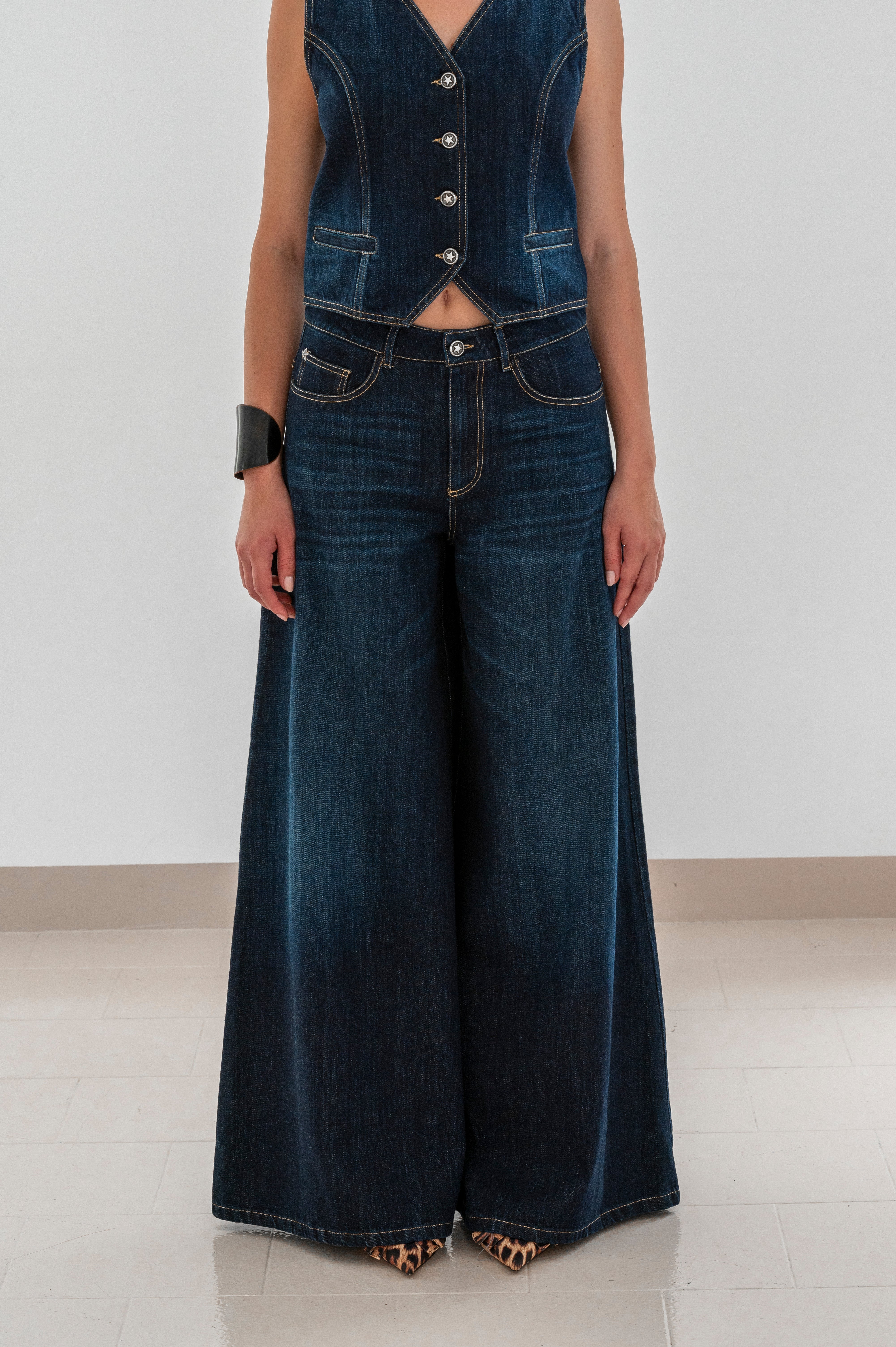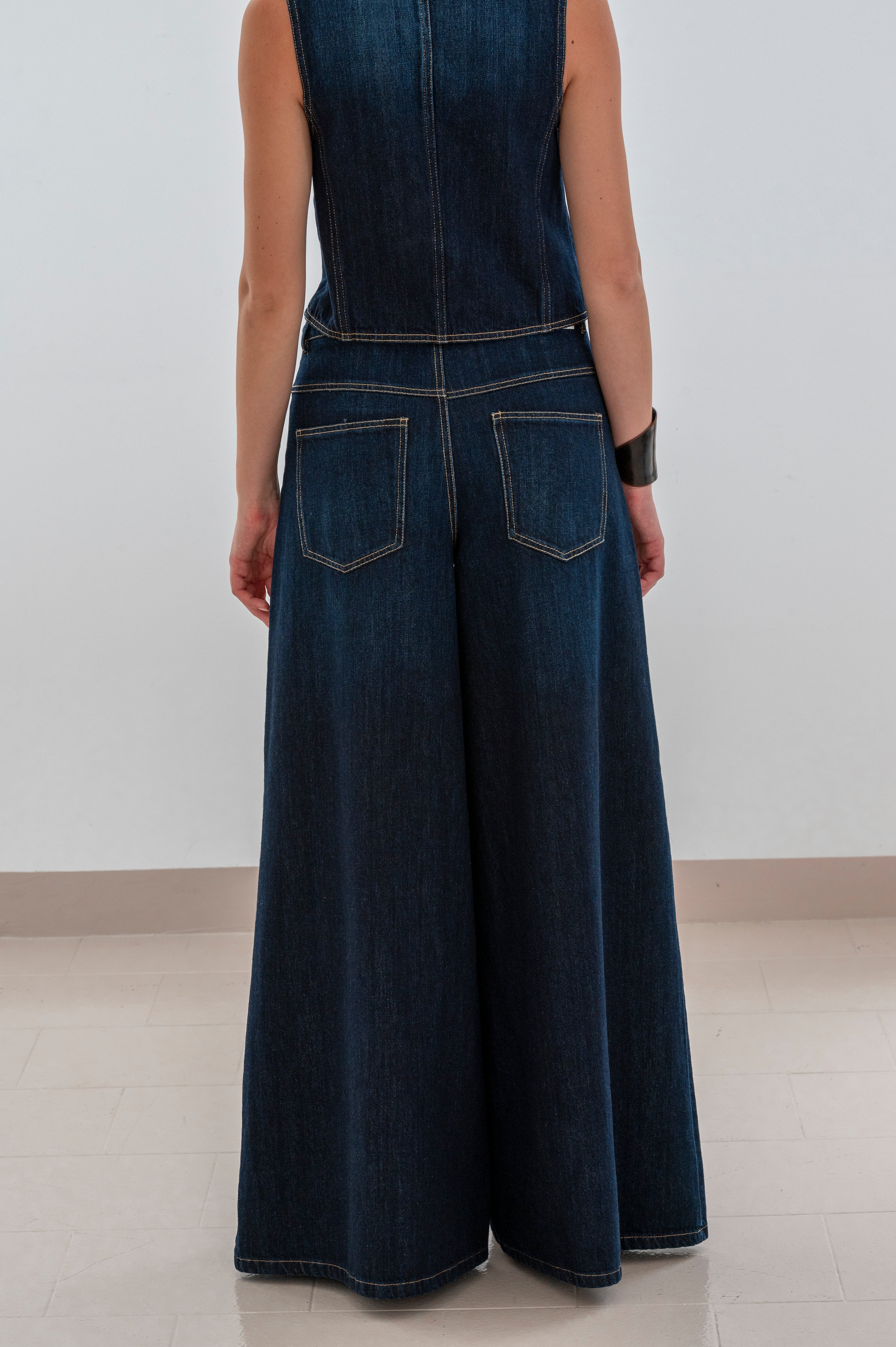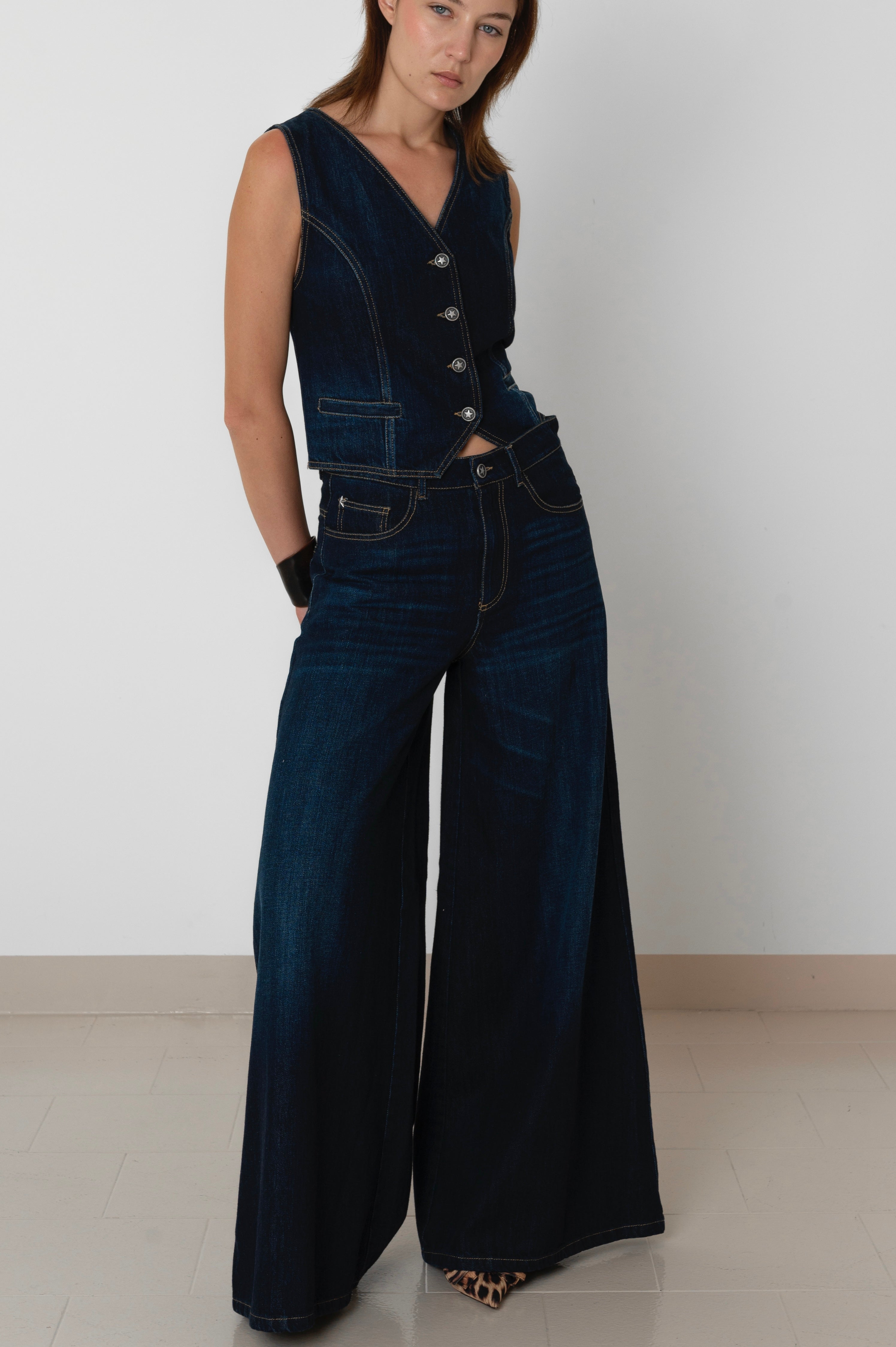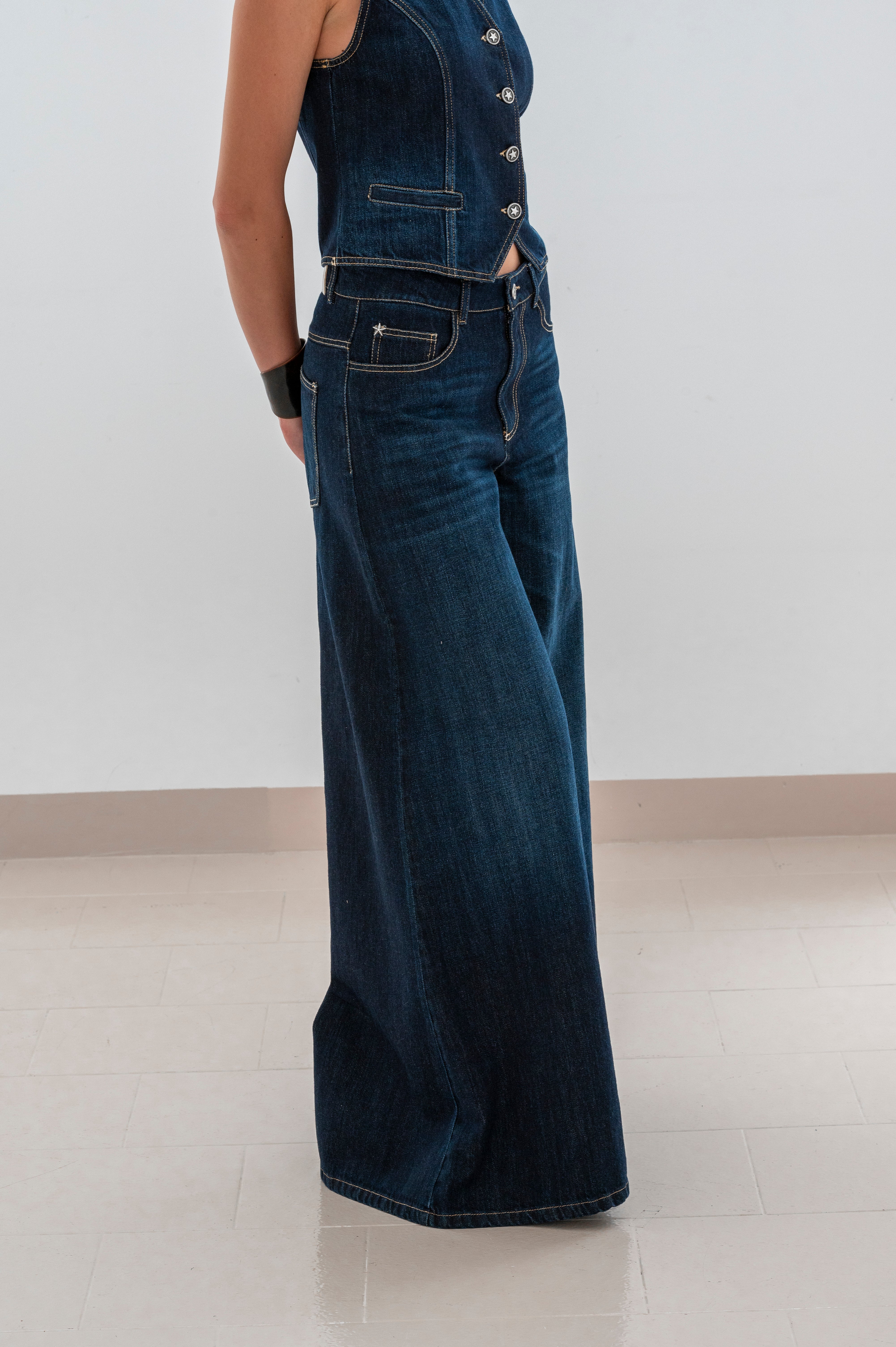 Design: Pantalone palazzo lavaggio scuro, vita alta e gamba ampia. Cuciture a contrasto e finitura pulita, cinque tasche.
